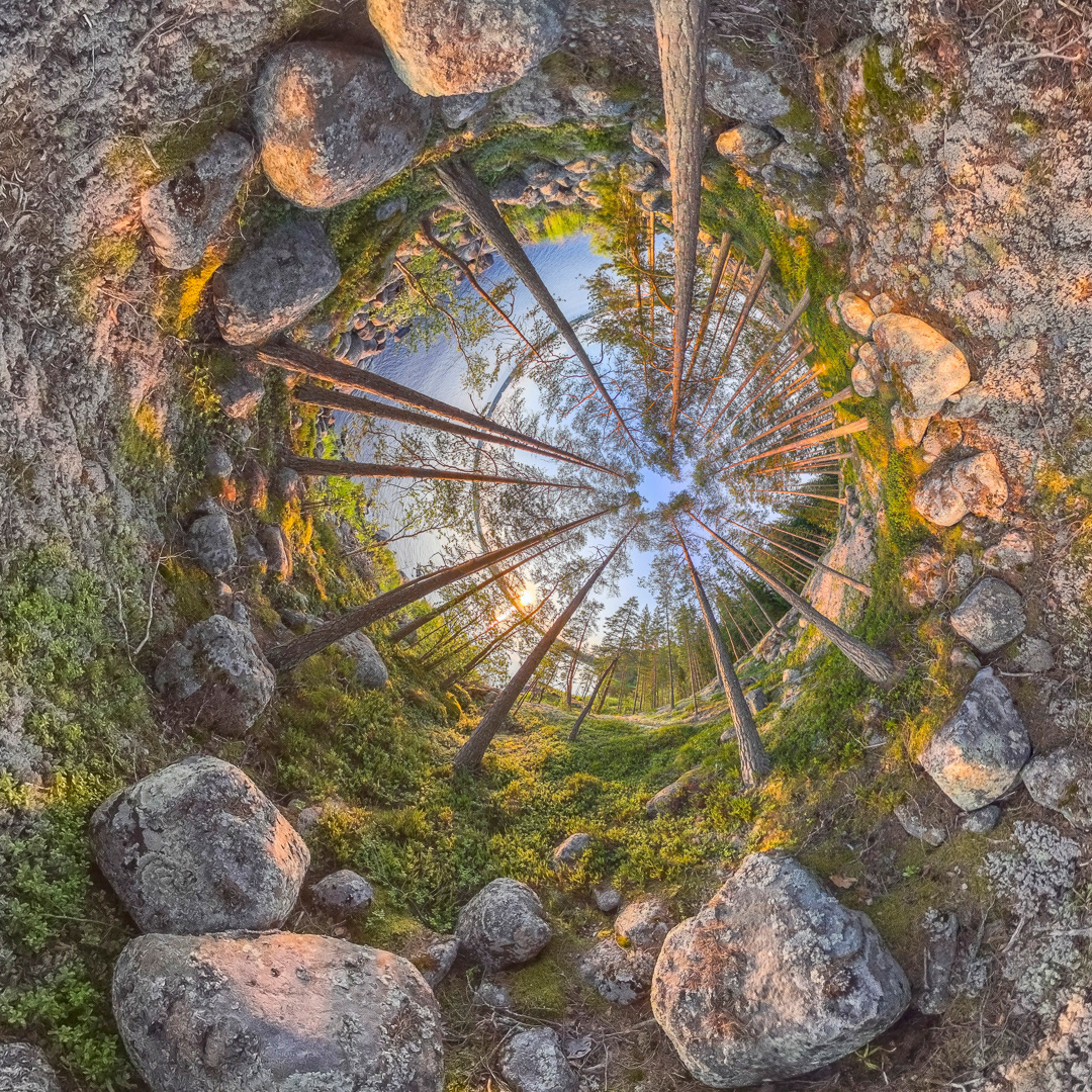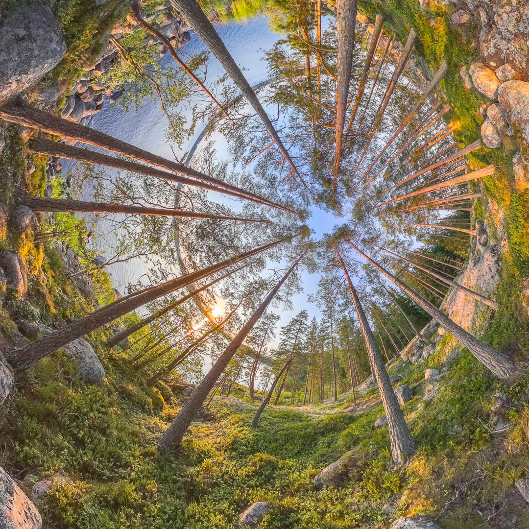 Luonnonsuojelualuetta 360° kuvana marraskuisena pakkasaamuna Helsingin Vanhankaupunginlahdella. Pitkospuut johtavat Lammassaareen. Taustalla näkyy Kalasataman pilvenpiirtäjät ja Arabianrantaa. Marraskuu 2024.