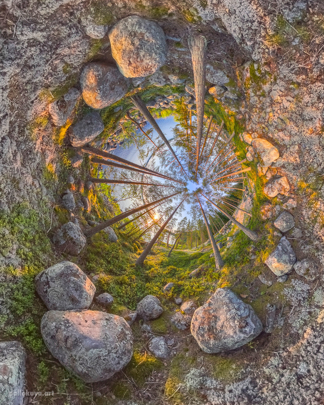 A pine forest in a small island located in a lake in central Finland just before a late summer sunset. On a ground there was lot of stones and the surface was covered by lichen.