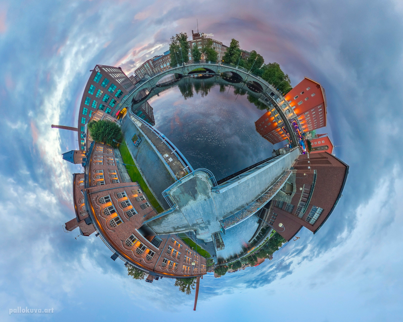 The photo shows a scene in the iconic Tammerkoski rapids landscape in Tampere, Finland.